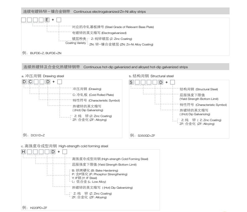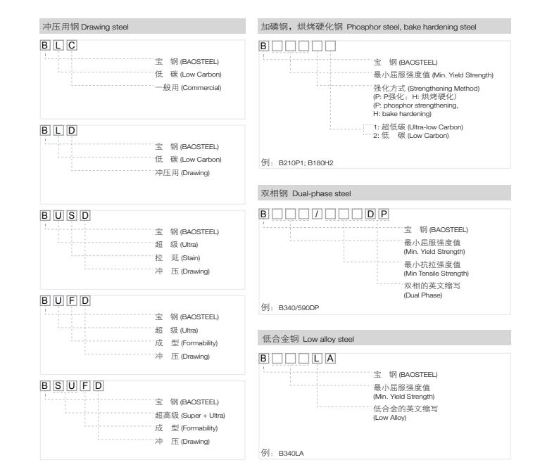 寶鋼產(chǎn)品的牌號(hào)一部分直接使用國(guó)外標(biāo)準(zhǔn)的牌號(hào),一部分采用自己的命名方式命名。現(xiàn)簡(jiǎn)要介紹寶鋼自己命名的牌號(hào)的方法。