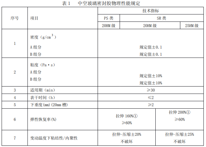中空玻璃彈性密封膠的物理性能應(yīng)符合表 1 的規(guī)定。